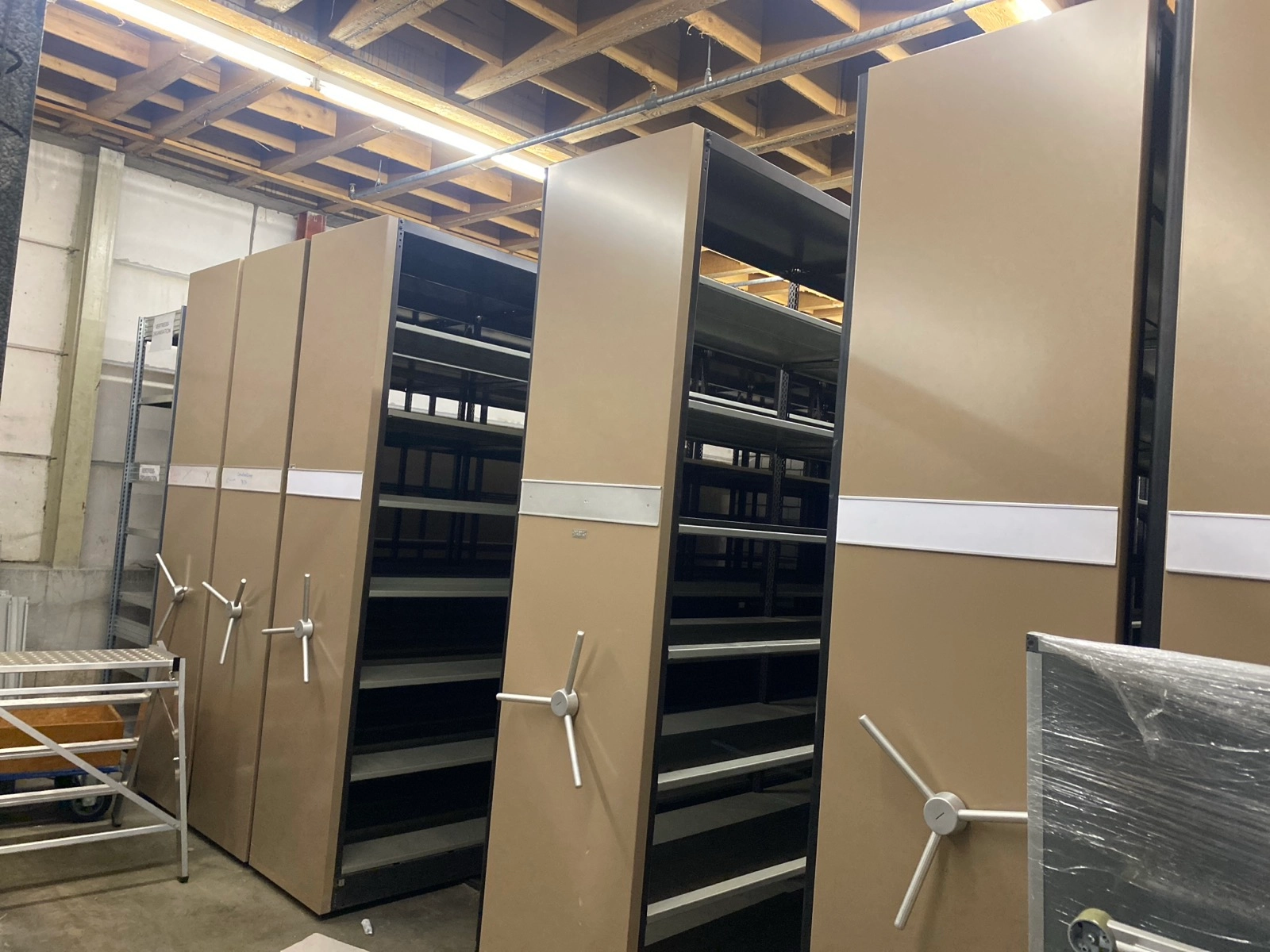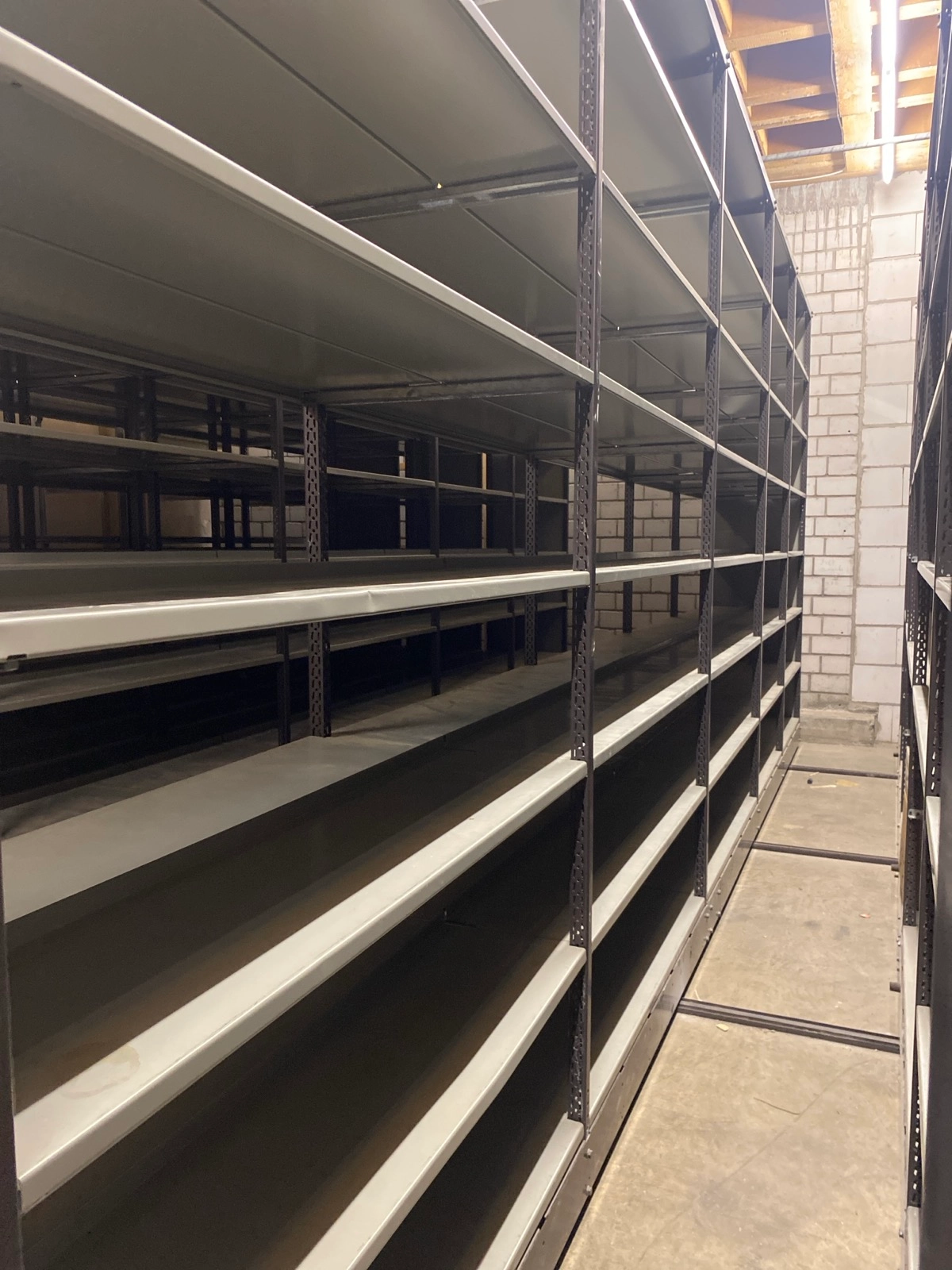 - Regalsystem: 13 Schwerlastregale je 6 m Länge (60 cm tief, 2,5 m hoch, 6/7 Böden)